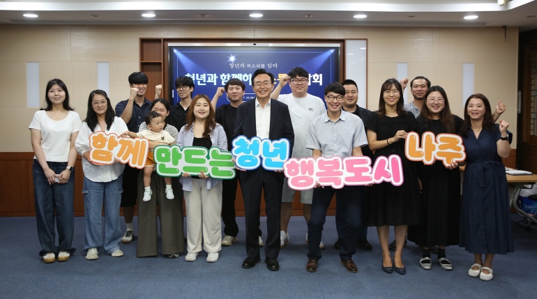 윤병태 나주시장이 지난 7월에 개최한 청년소통간담회에 참석한 청년들과 함께 사진 촬영을 했다 |