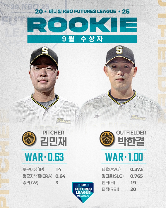 투수 부문 수상자인 상무 김민재는 신일고와 동원과학기술대를 거쳐 2024 신인 드래프트에서 8라운드 76순위로 지명되어 KIA에 입단했으며, 2025년 5월 상무에 입대했다. 한편, 타자 부문 수상자인 상무 박한결은 경북고를 졸업하고 2023 신인 드래프트 2라운드 14순위로 NC에 지명된 뒤, 마찬가지로 올해 5월 상무에 합류해 퓨처스리그에서 꾸준히 활약하고 있다.