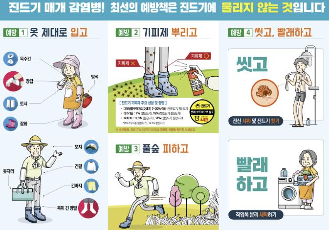 예방을 위해서는 농작업·산나물 채취·텃밭 가꾸기·등산 등 야외활동 시 풀밭에 직접 앉지 말고, 긴팔과 긴바지를 착용해 피부 노출을 최소화해야 한다.