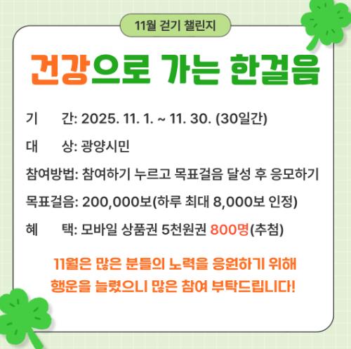 | 광양시, 워크온 ‘건강으로 가는 한걸음 11월 걷기 챌린지’ 운영 |