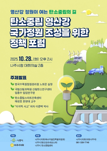 행사는 나주시의회 에너지발전특별위원회(위원장 김강정), 나주시 탄소중립센터(센터장 이상득), 영산강르네상스과(과장 강정석)가 주관하며, 시의원과 관련 부서장, 관계 기관, 시민 등 200여 명이 참석해 영산강 국가정원의 미래 비전과 정책 과제를 함께 논의할 예정이다.