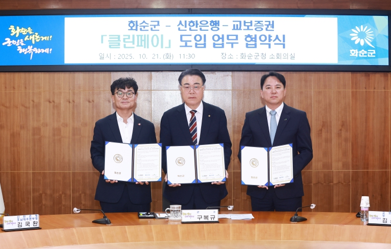 화순군청 소회의실에서 화순군, 신한은행, 교보증권이 클린페이 도입 혁약하는 장면(왼쪽부터 김국환 신한은행 본부장, 구복규 화순군수, 김윤상 교보증권 상무) |