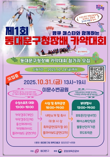 카약대회는 구민 누구나 참여 가능한 대회로, 모집 부문은 스탠드업 패들보드(SUP) 개인전, 카약 개인전·단체전(2인 1조)으로 진행된다. 참가 신청은 24일까지 QR코드를 통해 네이버폼으로 접수 가능하다. 자세한 사항은 동대문구청 체육진흥과로 문의하면 된다.