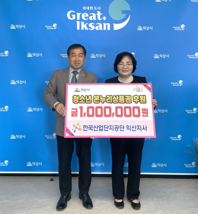 이날 한국산업단지공단 익산지사는 온누리상품권 100만 원을 익산시청소년상담복지센터에 전달했다. 전달된 상품권은 센터에 등록된 학교 밖 청소년과 저소득층 청소년들에게 지원될 예정이다.