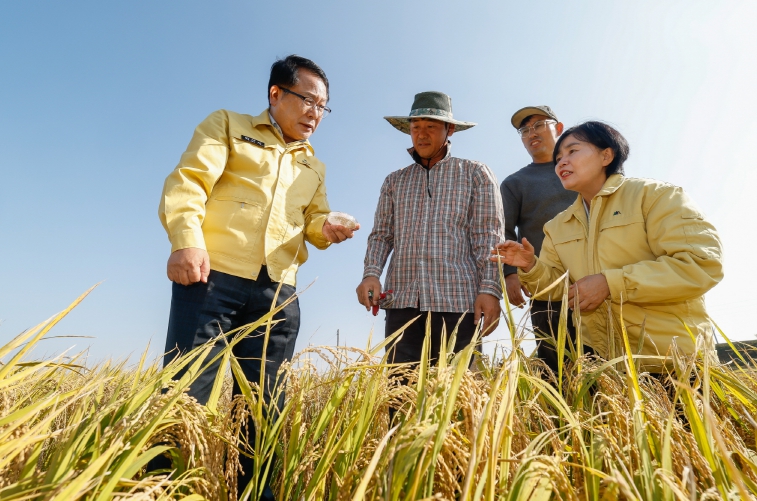 이날 정헌율 시장은 안성환 우리밀영농조합법인 대표의 농가 포장을 방문해 피해 벼를 직접 살펴보고, 농가의 애로사항을 청취했다. 현장에는 가루쌀 및 벼 재배농가, 관계 공무원 등 10여 명이 함께했다.