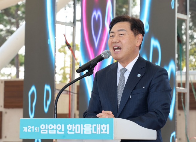 | 31일 군산시 새만금 비응공원에서 도내 임업인들의 화합과 소통을 위한 ‘제21회 임업인 한마음대회’에 참석한 김관영 전북특별자치도지사는 ‘새로운 전북, 특별한 기회’가 산림에서부터 시작될 수 있도록 최선을 다하겠다”고 말하고 있다. |