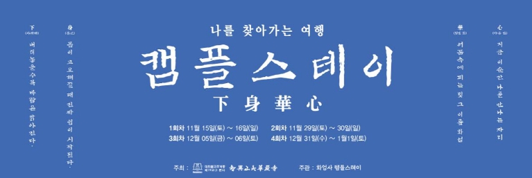 교구장 우석스님은 캠플스테이 슬로건 하신화심(下身華心)은 “몸을 낮추는 순간, 마음은 화엄의 꽃처럼 피어난다”라는 의미를 가지고 있다.” “추운 겨울 야외에서 1박 2일 캠플스테이 통해 몸을 낮추어 비울 때 마음의 빈공간을 채우고 새로운 시작을 할 수 있도록 돕는 것이 이 프로그램의 목표”라고 전했다.
