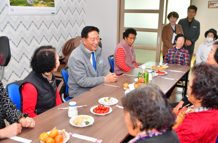 | 19일 남면 죽분경로당을 찾은 김한종 장성군수가 어르신들과 환담을 나누고 있다. |