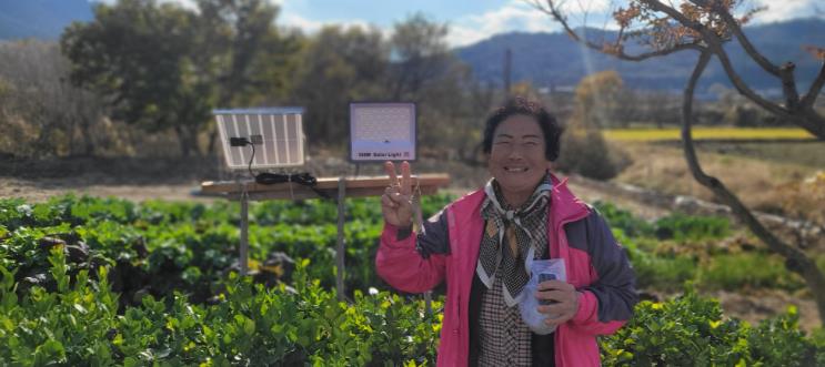 | 설치된 태양광 외등 앞에서 사진을 찍은 지원 가구 |