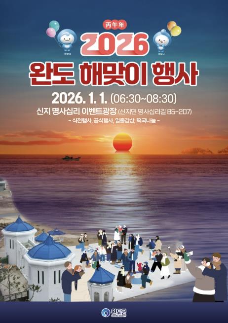 군 관계자는 “국도 77호선 해안도로 드라이브를 즐긴 후 청해포구 촬영장에서 낭만적인 일몰을 감상하며 한 해를 마무리하고, 새해 첫날 완도에서 일출을 보며 밝고 희망찬 새해를 맞이하시길 바란다”라고 말했다.