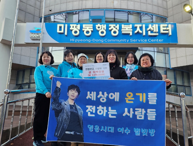 유수성 미평동장은 “어려운 이웃을 위해 따뜻한 나눔을 실천해 주신 ‘영웅시대 여수별빛방’ 회원 여러분께 감사드린다”며 “기탁된 성금은 저소득층을 위해 소중히 사용하겠다”고 말했다.