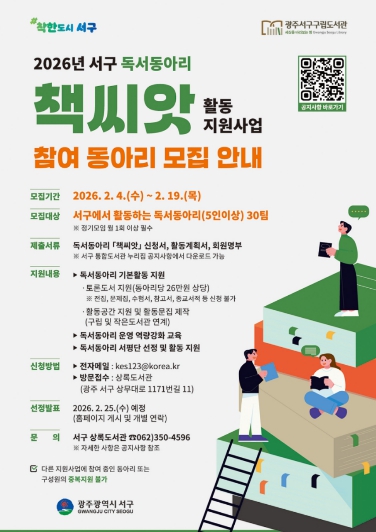 김이강 서구청장은 “주민들이 함께 읽고 함께 나누는 생활 독서가 일상에 자리 잡을 수 있도록 독서동아리 ‘책씨앗’ 사업을 지속적으로 추진하겠다”며 “올해도 많은 독서동아리가 적극 참여해 주길 바란다”고 말했다.