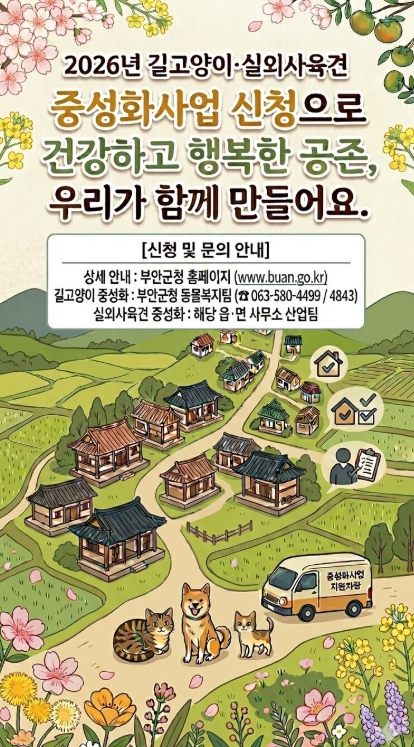 | 부안군, 2026년 실외사육견·길고양이 중성화 지원사업 |