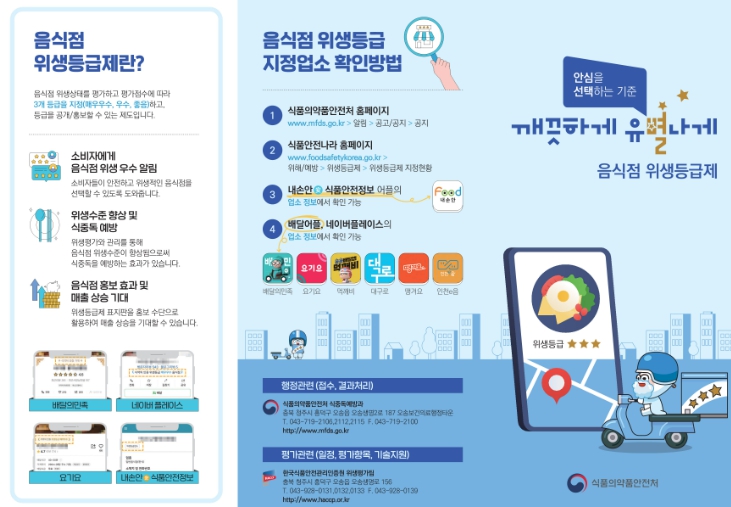 ‘음식점 위생등급제’는 영업자가 위생등급 평가를 신청하면 한국식품안전관리인증원이 음식점의 위생 상태를 평가해 ‘매우우수’, ‘우수’, ‘좋음’ 등 3개 등급을 지정·공개하는 제도로, 2017년 5월부터 시행되고 있다.