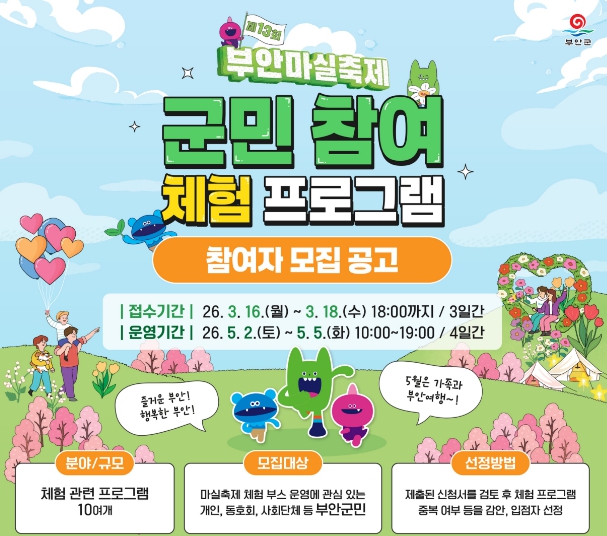 | 제13회 부안마실축제 군민 참여 체험 프로그램 운영자 모집 |