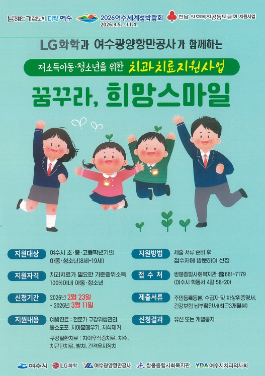 | 여수시가 민·관이 협력해 저소득 아동·청소년의 구강건강 증진을 위한 치과치료 지원사업 「2026 꿈꾸라, 희망스마일」을 추진한다. |