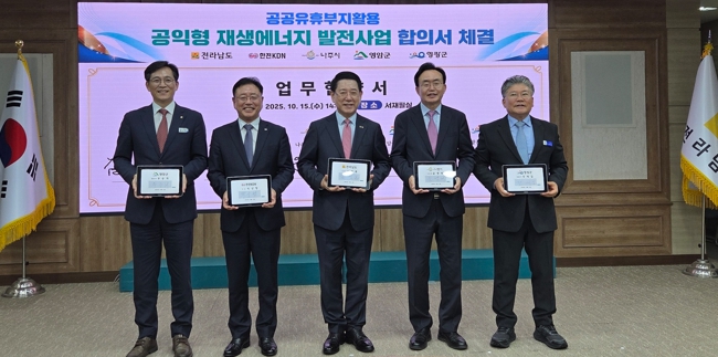 | 나주시가 지난해 10월 전라남도, 영암군, 영광군, 한전KDN(주)과 함께 ‘공익형 재생에너지 발전사업’ 업무협약을 체결했다. |
