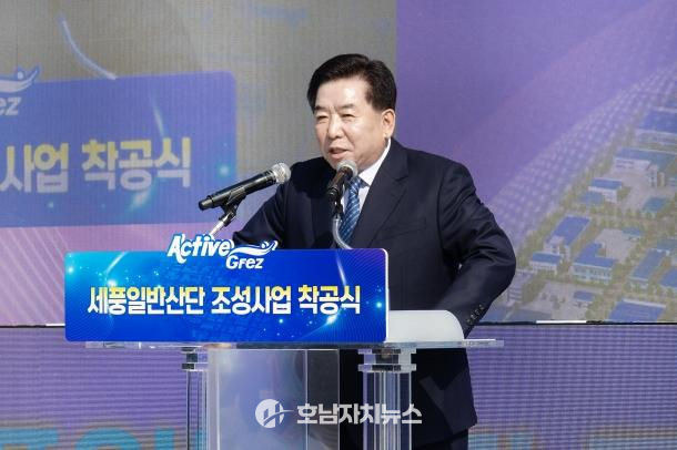| 5일 광양시 광양읍 세풍리 일원에서 열린 세풍일반산업단지 조성사업 착공식에서 구충곤 광양만권경제자유구역청장이 환영사를 하고 있다. |