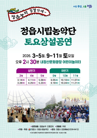 이학수 시장은 “정읍농악만의 다양하고 특화된 프로그램을 알차게 준비해 관람객들의 큰 호응을 이끌어낼 계획”이라며 “앞으로도 수준 높고 다채로운 무대를 꾸준히 선보여 시민들에게 변함없이 사랑받는 토요 상설공연으로 자리매김하도록 최선을 다하겠다”고 전했다.