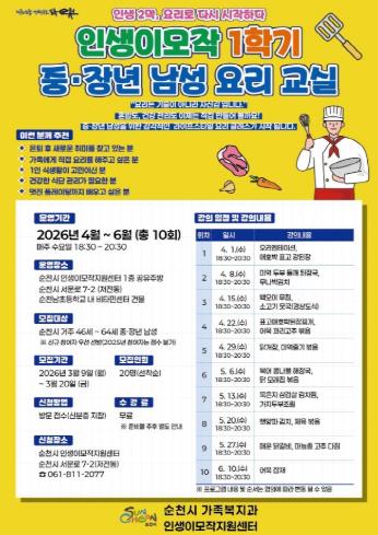 | 순천시 인생이모작지원센터, 중·장년 남성 요리 교실 수강생 모집 |