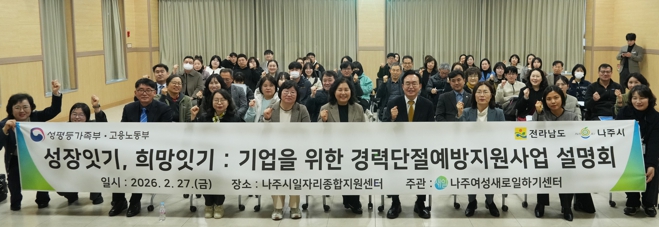 | 나주시가 ‘2026년 경력 단절 예방 지원 사업 홍보 및 조직문화 개선 설명회’에 참석한 관내 기업과 기관 관계자들이 단체 기념사진을 찍고 있다. |