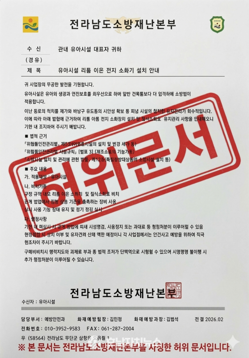 이번에 발견된 허위 문서(사진 참조)는 ‘유아시설 리튬 이온 전지 소화기 설치 안내’라는 제목으로 관내 유아시설 대표자들을 수신자로 발송되었다. 해당 문서는 소방 관련 법령을 교묘하게 짜깁기하여 유아시설 내 리튬 이온 소화기 및 질식소화포 비치를 법적 의무인 것처럼 위장하고 있다.