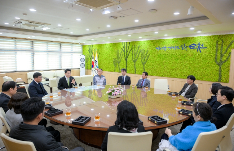 | 지방세 유공납세자에게 인증패를 수여하고 차담을 나누고 있다. |