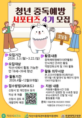 익산시는 중독관리통합지원센터에서 만 18~39세 청년을 대상으로 오는 22일까지 '청년 중독 예방 서포터즈 4기'를 모집한다고 13일 밝혔다.