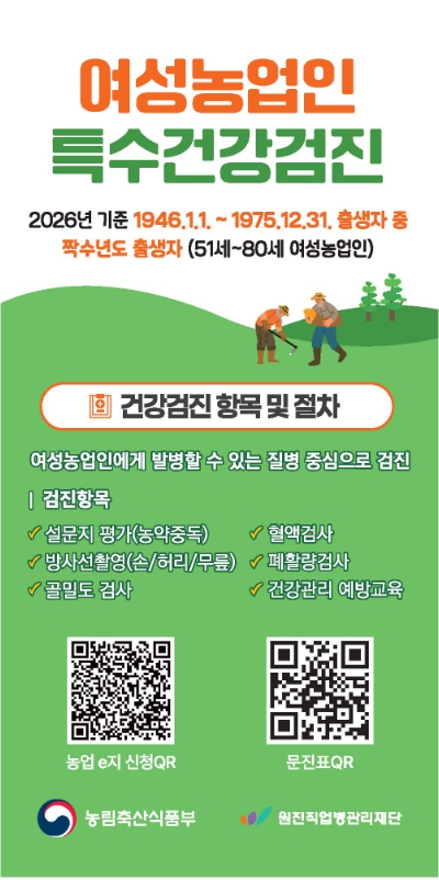 지원 대상은 옹진군에 거주하며 농업경영체에 등록된 짝수년도 출생의 51세부터 80세까지 여성농업인으로, 올해는 총 60명을 대상으로 실시되며, 검진 비용은 1인당 22만 원이며, 이 중 19만8천 원은 보조금으로 지원되고 본인 부담금은 2만2천 원이다. 신청은 농업e지 홈페이지 또는 모바일 앱을 통해 가능하며, 가까운 면사무소를 방문해 신청할 수도 있다.