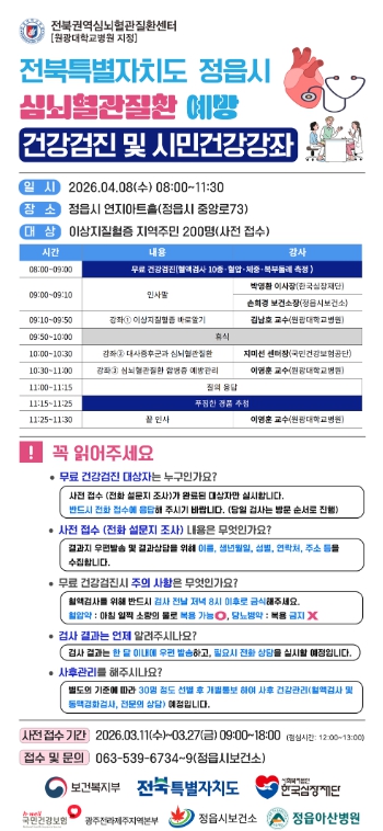 행사는 오는 4월 8일 오전 8시부터 11시 30분까지 정읍시 연지아트홀에서 열린다. 당일 현장에서는 사전 접수한 참여자를 대상으로 10종의 무료 혈액검사를 실시하며 전문의가 직접 진행하는 건강강좌와 맞춤형 건강 교육 프로그램이 차례로 제공된다.