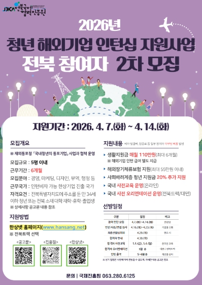 | (포스터)‘해외에서 시작하는 첫 커리어’ 전북 청년 인턴십 2차 모집 |