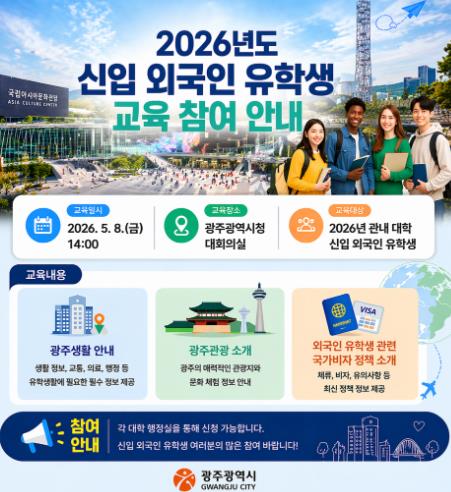 광주광역시는 오는 5월 8일 오후 2시 시청 대회의실에서 광주지역 대학에 입학한 유학생들을 대상으로 ‘2026년 신입 외국인 유학생 교육’을 실시한다.
