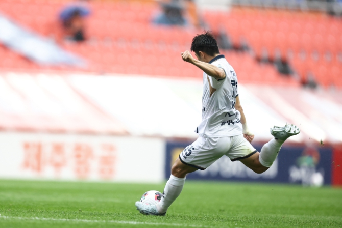 | 4월 18일 제주 원정경기에서 김천상무 박태준이 프리킥을 차고 있다 |