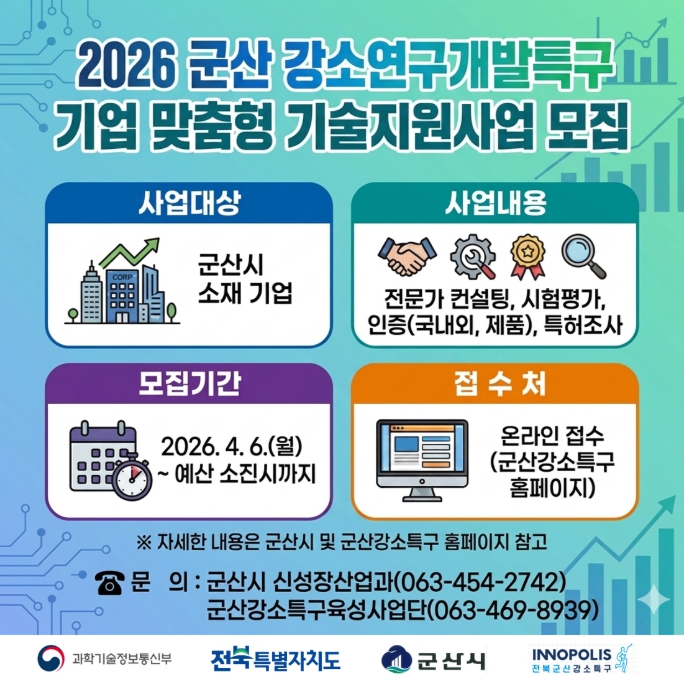시 관계자는“이번 사업은 2년 연속 최우수 특구로 선정된 군산 강소특구의 우수한 인프라를 활용해 기업의 성장 주기별 맞춤형 사다리 역할을 하는 것이 핵심”이라며 “현장의 목소리를 반영한 밀착형 기술지원을 통해 우리 기업이 한단계 더 도약하고 지역 경제의 든든한 버팀목이 되도록 하겠다”라고 밝혔다.