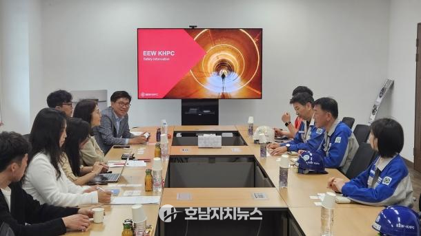 | 광양경자청과 코트라 종합행정지원센터 관계자들이 4월 20일 광양항 배후단지 내 외국인투자기업 EEW KHPC를 방문해 기업 애로사항을 청취하고 사내유보금 활용 재투자 인센티브를 안내했다. |