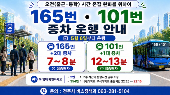 이에 시는 활용 가능한 예비 차량을 혼잡 시간대에 투입해 배차간격을 단축하고, 승객을 분산시켜 차내 혼잡도를 완화하기로 했다. 증차 대상 노선은 165번 노선과 101번 노선으로, 아침 첨두시간대에 집중 배차된다.