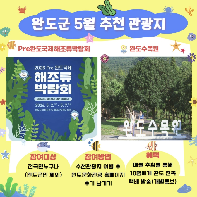 군 관계자는 “5월은 가정의 달인 만큼 가족들과 함께 완도를 찾아 추억을 쌓고 힐링하는 시간 가져보시길 바란다”라고 말했다.