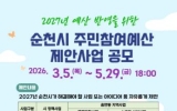 순천 이원희 기자2026. 03.05[호남자치뉴스]순천시는 2027년도 예산편성 과정에 시민의 다양한 의견과 아이디어를 반영하기 위해 3월부터 5월까지 주민참여예산 제안사업을 접수한다고 밝혔다. 주민참여예산제는 시민이 직접 지역에 필요한 사업을 제안하고, 이를 예산에 반영함으로써 재정 운영의 투명성과 민주성을 높이는 제도이다. 시민의 시각에서 생활 속 불편사항을 발굴하고, 지역 현안 해결을 위한 정책을 제안할 수 있다는 점에서 실질적인 참여 행정의 대표제도로 자리매김하고 있다. 순천시는 2021년부터 24개 읍면동 주민자치회를 전면 시행해 왔으며, 주민참여예산...