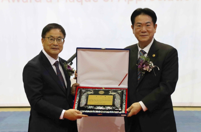 | 윤웅석 국기원장이 이동섭 전 국기원장에게 감사패를 전달하고 기념촬영을 하고 있다. |