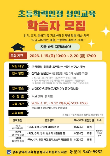 교육은 초등학력 취득을 희망하는 성인이면 누구나 참여 가능하며 단계별 15명씩 총 45명을 선착순으로 모집한다. 교재를 포함한 수강료는 전액 무료다.